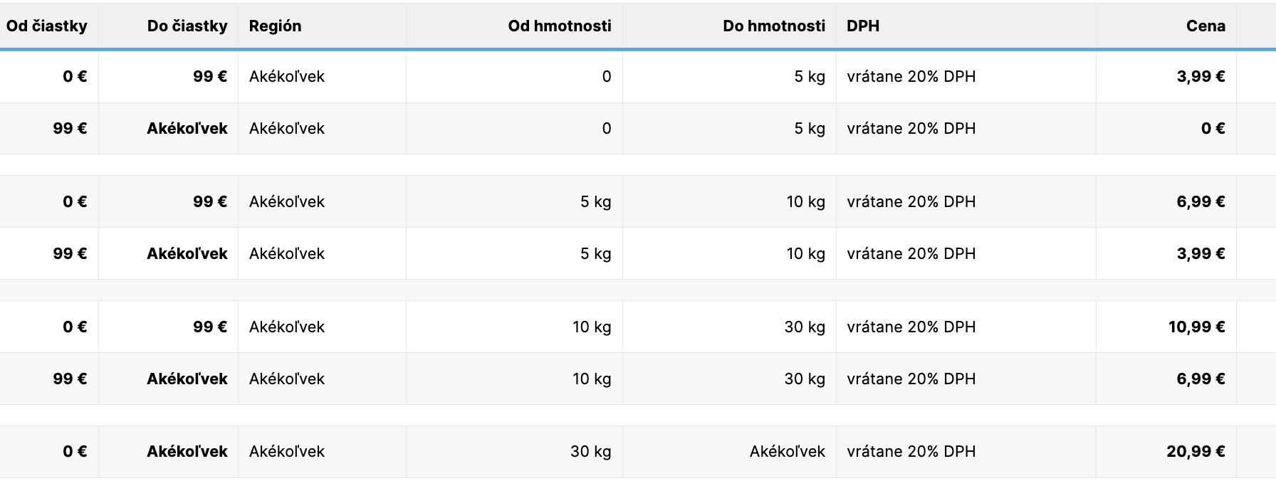 7.1. Spôsoby dopravy a cena za dopravu objednaných produktov: